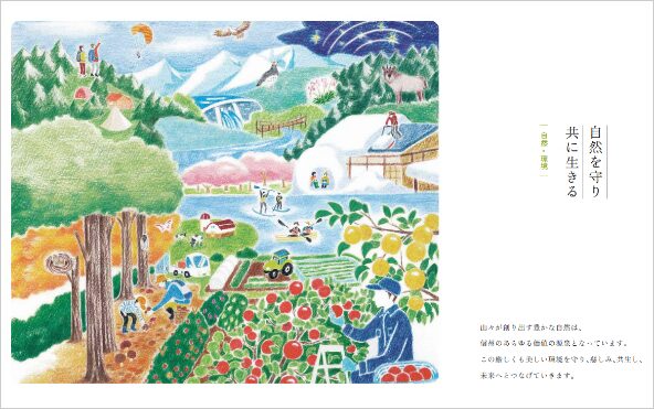 信州に息づく“しあわせ”を分かち合い、山々に囲まれたヒト・コト・モノが調和する、平和ですこやかな長野県をみんなでともに築いていくことを目指しています。