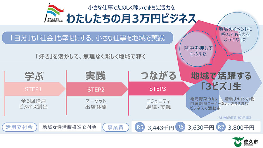 「わたしたちの月3万円ビジネス」は、ライフステージの変化に伴う制約を受けやすい女性が、月に3万円稼ぐビジネスを生み出すことで自分らしく活躍する場を創出するため「佐久市 女性活躍推進パッケージ」の施策の1つとして推進する事業です。