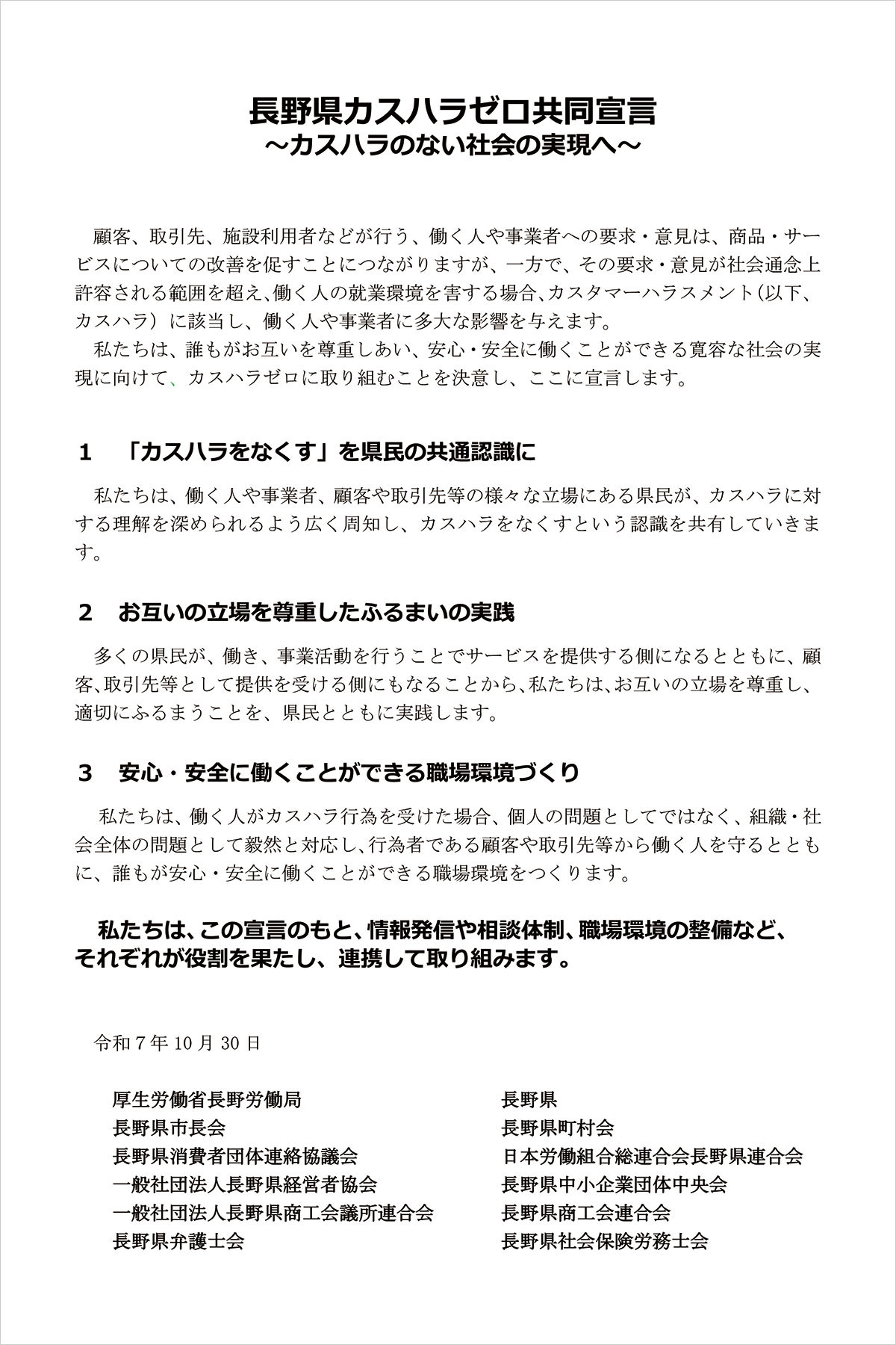 これらの取組に加えて、カスハラをなくす社会的な気運を高めるため、令和7年10月30日、県を含む行政機関、労働団体、事業者団体、消費者団体、専門家の計12団体が共同で「長野県カスハラゼロ共同宣言~カスハラのない社会の実現へ~」を行いました。宣言の3本柱は次のとおりです。